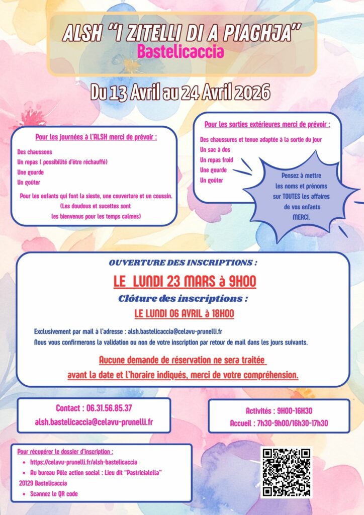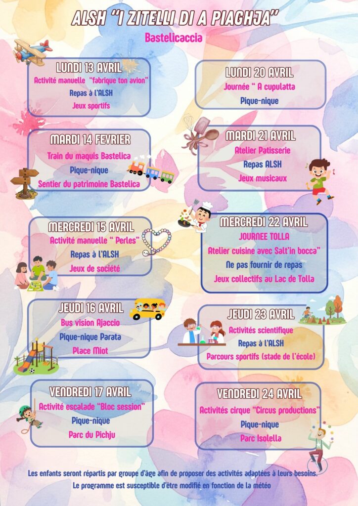 celapru2a Le programme des vacances de Printemps dans votre ALSH I Zitelli di a Piaghja à Bastelicaccia est arrivé !!! Posted on 30 mars 202630 mars 2026 Renseignements et inscriptions :